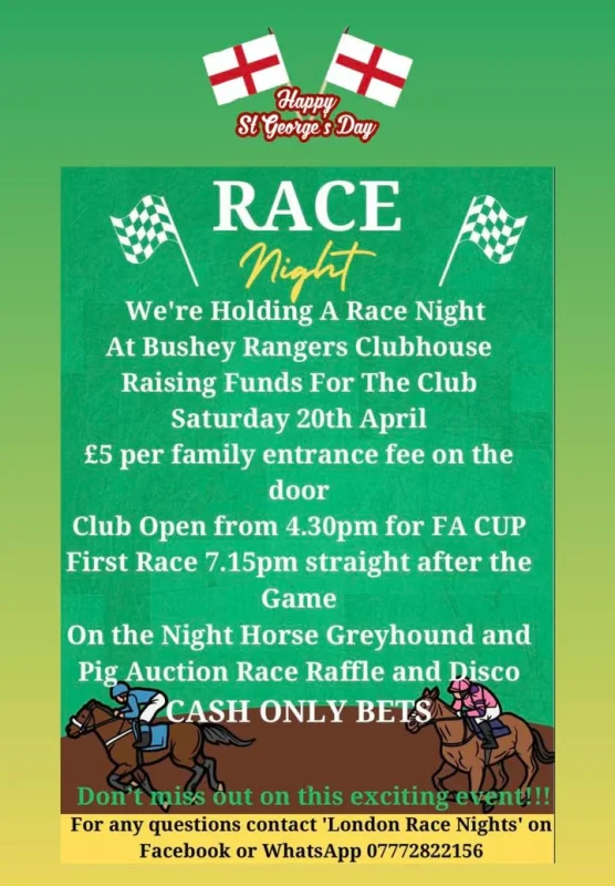 Celebrate St George’s Day At The Rangers Race Night 🏴🏇🍺 With Pints Of Fosters, Carlsberg & Amstel £4 From 7.30 Til Close.