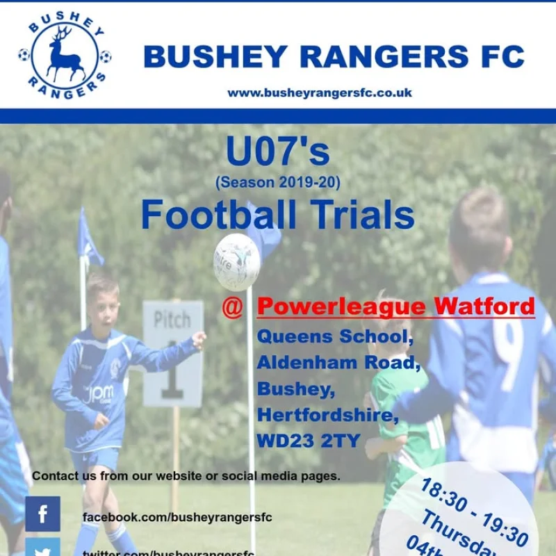 A reminder that Bushey Rangers FC Under 7's Football Trials are happening today at 18:30 at Powerleague Watford.